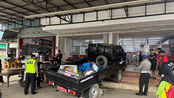 Akibat benturan tersebut, kendaraan pick up kehilangan kendali dan oleng kearah kanan jalan hingga menabrak teras sebuah warung.