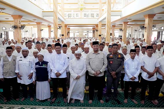 BERSAMA JEMAAH – Wakil Bupati Banjar Habib Idrus Al Habsyi (tengah), Sekda Banjar Yudi Andre, undangan, dan para jemaah calon haji Kabupaten Banjar foto bersama saat Acara Pelepasan dan Salat Hajat di Masjid Nurul Iman Desa Indrasari Kecamatan Martapura.(foto;mb/ist)