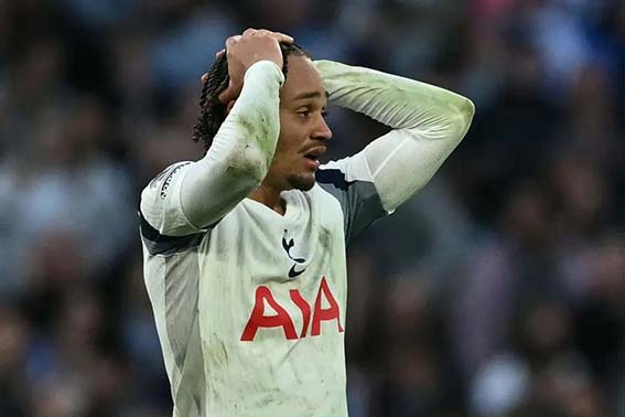 Gelandang Tottenham Xavi Simons bereaksi setelah timnya ditahan imbang Brighton dengan skor 2-2 pada pekan 33 Liga Inggris di Stadion Tottenham Hotspur, London, Sabtu (18/4) waktu setempat.(foto:mb/ premierleague.com