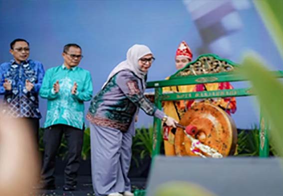 WALIKOTA Banjarbaru Erna Lisa Halaby memukul gong menandai dibukanya Banjarbaru Expo dan Job Fair dalam rangka peringatan Hari Jadi ke-27 Banjarbaru Lapangan Dr Murdjani Kota Banjarbaru, Jumat (17/4). (Foto:mb/ant/mc kominfo bjb)