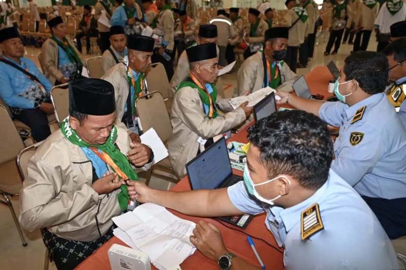 CEK DOKUMEN VAKSIN – Petugas Karantina Kesehatan melakukan pengecekan dokumen vaksin jamaah calon haji kelompok terbang (keloter) pertama dari Kabupaten Lombok Timur setibanya di Asrama Haji Embarkasi Lombok di Mataram, NTB, Selasa (21/4). Sebanyak 5.798 jamaah calon haji asal NTB yang terbagi dalam 15 kloter dijadwalkan berangkat menuju Makkah melalui Bandara Internasional Zainuddin Abdul Madjid (BIZAM) mulai 22 April hingga 10 Mei 2026.