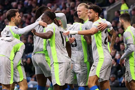 Merayakan Gol – Para pemain Manchester City merayakan gol yang dicetak penyerang Erling Haaland pada pertandingan Liga Inggris menghadapi Burnley di Stadion Turf Moor, Burnley, Rabu (22/4/2026) waktu setempat.(Foto;mb/ premierleague.com)