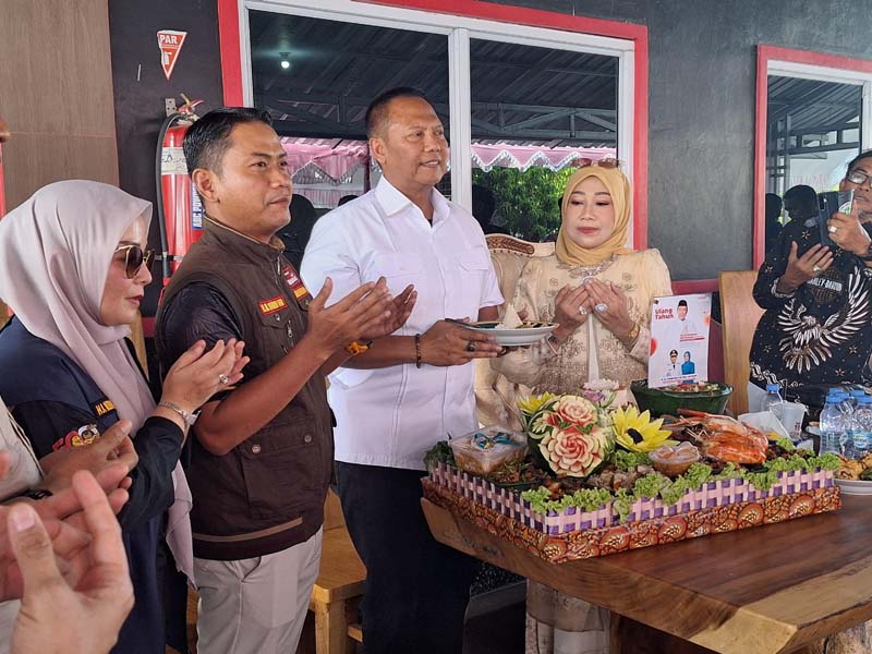 Ketua KONI Provinsi Kalsel yang lama Bambang Heri Purnama dan istri potong kue Ulang Tahun ke 59 disaksikan Walikota Banjarmasin Muhammad Yamin. (foto:mb/rds)