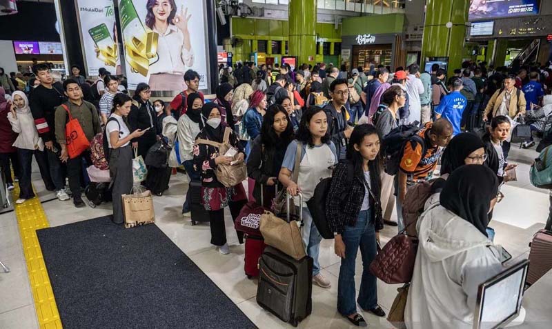 ANTRE – Calon penumpang mengantre untuk mendapatkan pengembalian bea tiket akibat pembatalan perjalanan di Stadion Gambir, Jakarta, Selasa (28/4). PT Kereta Api Indonesia (Persero) menghentikan sementara seluruh perjalanan kereta api jarak jauh dari Stasiun Gambir dan Pasar Senen, Jakarta, setelah insiden tabrakan antara Commuter Line dengan KA Argo Bromo di Stasiun Bekasi Timur.