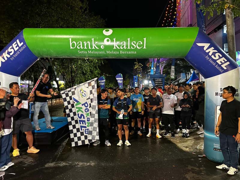 BANJARMASIN-Ratusan peserta memadati halaman Kantor Pusat Bank Kalsel untuk mengikuti AKSEL Fun Night Run 5K dalam rangkaian Pekan AKSEL 2026.Suasana malam di pusat Kota Banjarmasin tampak berbeda, Jumat (24/4).