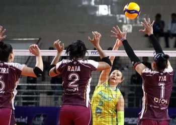 Pertandingan Proliga yang mempertemukan Jakarta Pertamina Enduro melawan Medan Falcons di GOR Ken Arok, Kota Malang, Jawa Timur, Minggu...