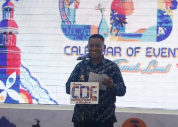 Wakil Bupati (Wabub) Tanah Laut (Tala), HM Zazuli saat menyampaikan sambutan pada peluncuran calender of event 2026 BANJARBARU...